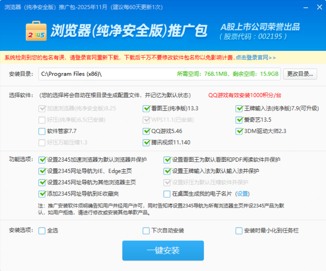 2345浏览器(纯净安全版)推广包是为了提升用户体验,全新上线的一款纯净无广告一键安装推广包。 集成了2345网址导航、2345加速浏览器(纯净版)、2345安全卫士(纯净版)、软件管家、2345输入法(纯净版)、2345好压(纯净版)(不计费)、2345看图王(纯净版)、WPS、爱奇艺、QQ游戏等能赚钱的计费产品。所有软件可以根据您的需求,自由勾选,一键安装!