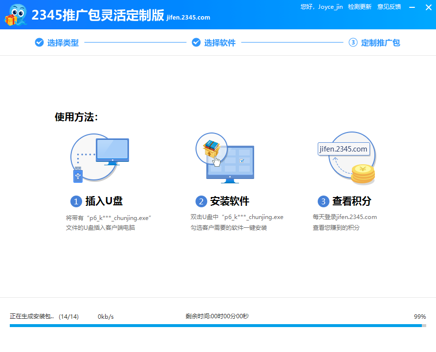 第一步:下载2345推广包灵活定制版,并且把U盘插在电脑上,选择您想推广的安装包类型。
